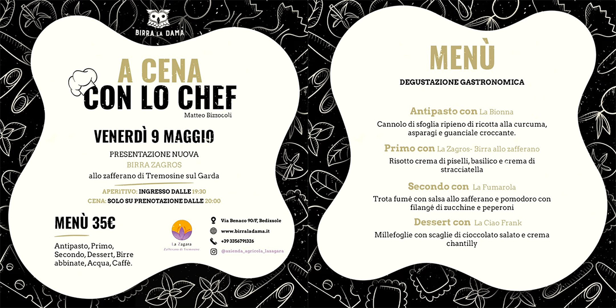 A Cena con lo Chef Matteo Bizzocoli sarà l’occasione perfetta per gustare un menù speciale, studiato per esaltare ogni abbinamento tra piatti e birre — compresa la grande novità: la nuova Zagros, birra dorata allo zafferano di Tremosine.