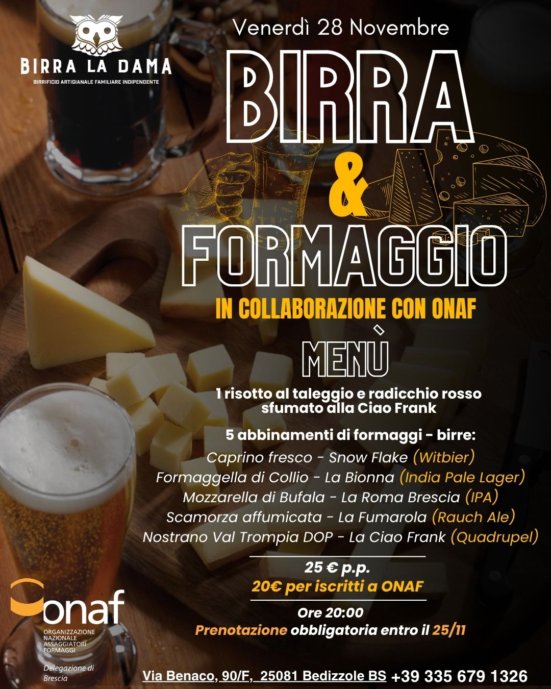 La serata inizia alle ore 20:00 nella nostra sede di Via Benaco 90/F, Bedizzole (BS). Il costo è di 25 € a persona, ma se sei iscritto a ONAF il prezzo scende a 20 €. Un motivo in più per non mancare.